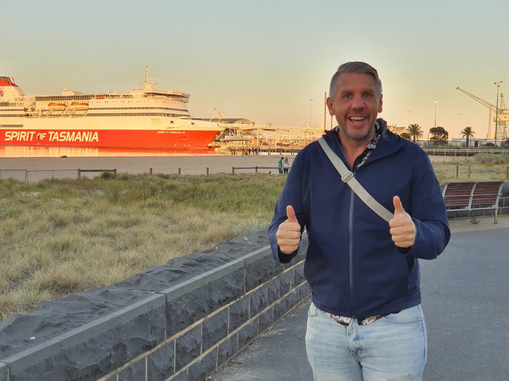 We then travelled from Devonport to Melbourne overnight on the Spirit of Tasmania, here is Ben the next day after our early morning arrival. We had an inside cabin and slept well, the ”SOT’ was somewhere between a ferry and a cruise ship and we quite enjoyed the experience as a one off. When parking our campervan we were behind a van carrying seven llamas who all stayed the night in the van, there are lots of facilities on-board including a cinema but we opted to download some Netflix shows and watch these in bed. When we arrived into Melbourne we were greeted with a crystal clear morning and hot air balloons making there way across the city skyline.