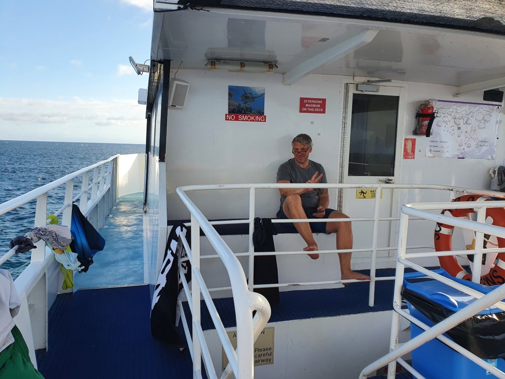 You can see an example of the maps show during our pre-dive briefings below and Ben on the top deck, also used as a drying deck for swimmers!