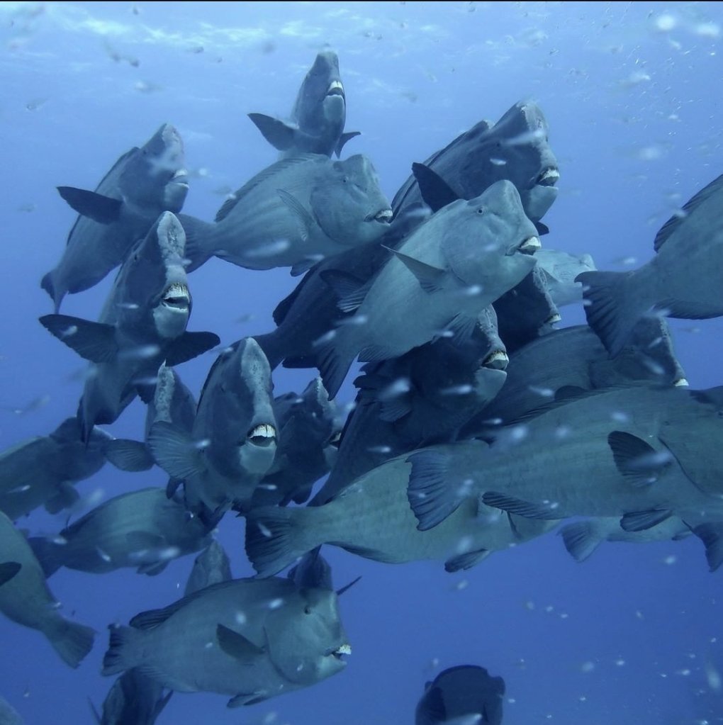 We also saw a big group of bumpy head parrot fish on our earliest dive when we were in the ocean before 6:30am on our last day, they have huge teeth and sleep together but roam alone during the day.